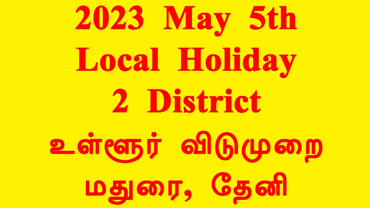 அனைத்து மாநில அரசு அலுவலகங்களுக்கும், நிறுவனங்களுக்கும் உள்ளூர் விடுமுறை (Local Holiday) நாளாக அறிவித்து ஆணையிடப்பட்டுள்ளது.மேலும் இந்த நாளில் அரசு பொதுத்தேர்வுகள் ஏதேனுமிருப்பின் சம்பந்தப்பட்ட தேர்வு எழுதும் பள்ளி மாணவர்கள் மற்றும் பொதுத்தேர்வு தொடர்பாக பணியாற்றும் ஆசிரியர்கள் மற்றும் அலுவலர்களுக்கு இந்த உள்ளூர் விடுமுறையானது பொருந்தாது.